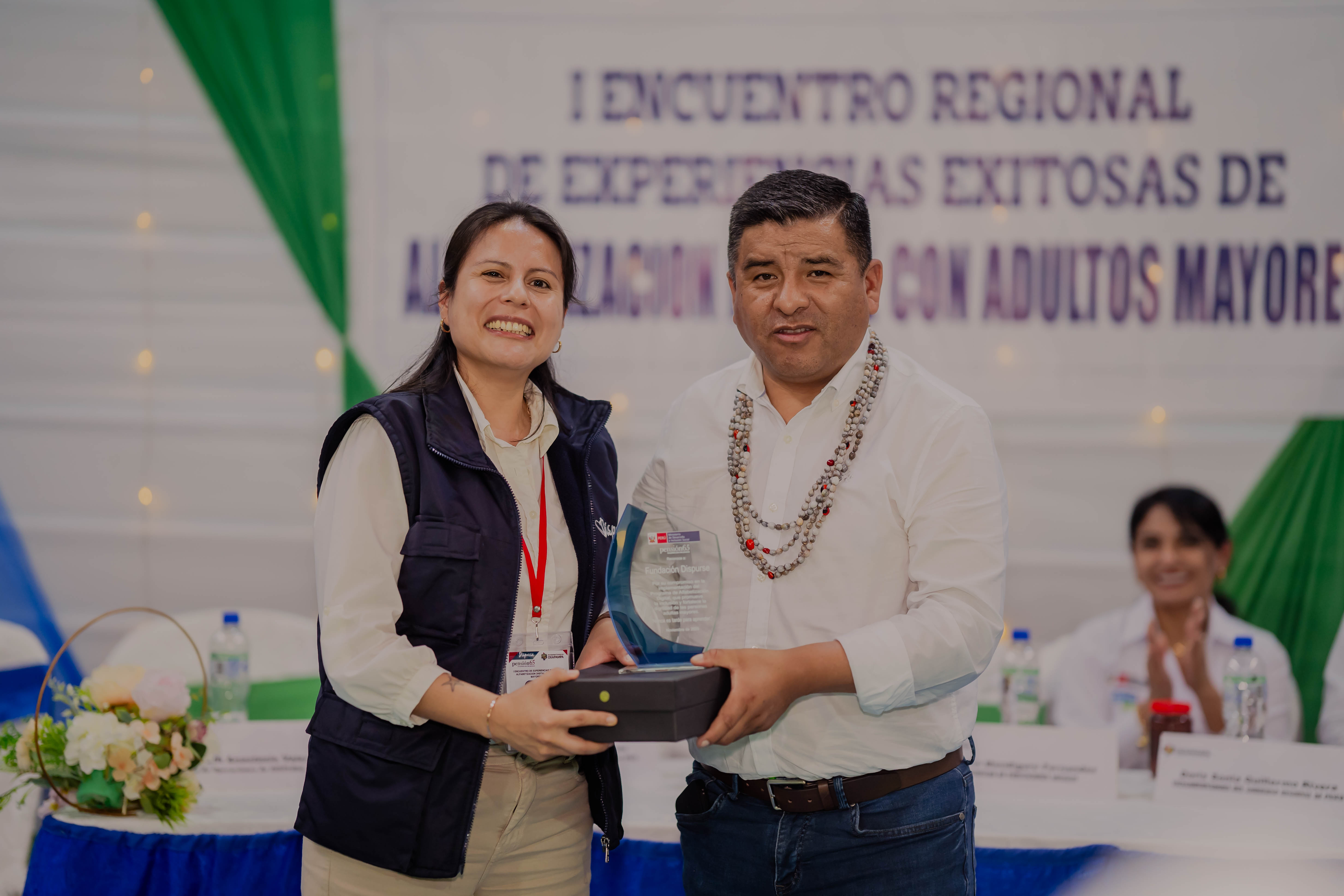 The recognition was presented during the central day of the meeting, which brought together national and local authorities, territorial teams, facilitators, and older adults from eleven districts of the Pasco region, as part of the coordinated work carried out under the Interinstitutional Cooperation Agreement between Pensión 65 and Dispurse Foundation.